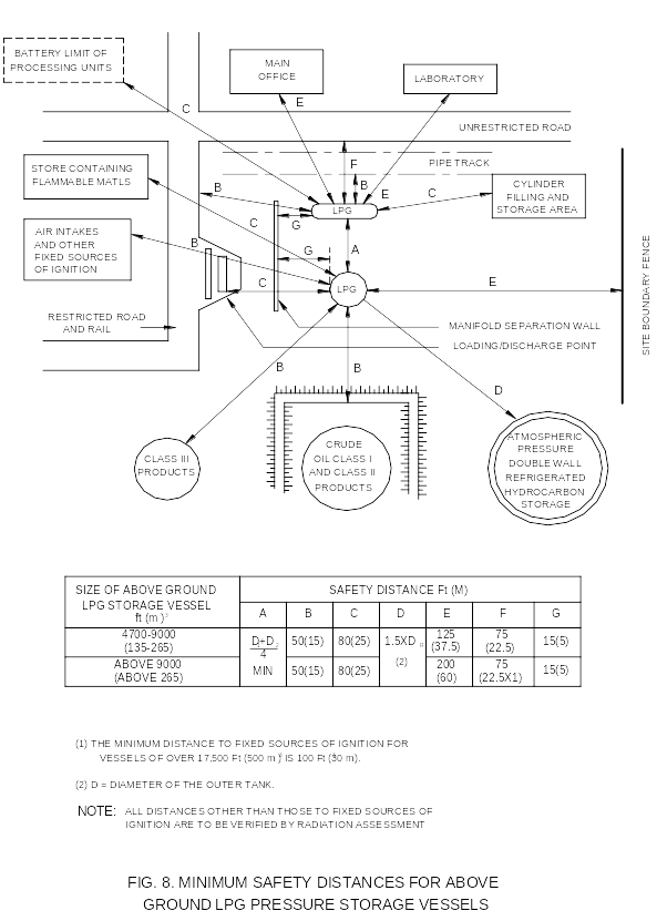 The layout should provide accessibility for fire-fighting and emergencies, and to minimise involvement to adjacent facilities in a fire (see Figure 1 for typical model). Minimum separation distances are laid down in below Tables :