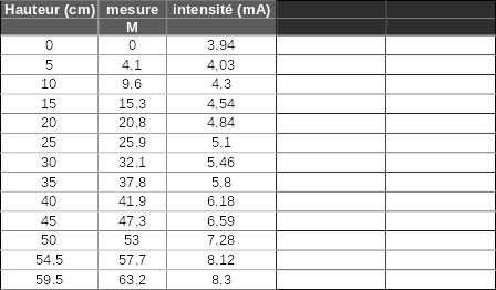 On démarre réservoir vide, puis on augmente progressivement la hauteur d’eau dans le réservoir en notant à intervalles réguliers après 10 secondes de stabilisation, la hauteur d’eau dans le réservoir, l’intensité dans la boucle de mesure et l’indication affichée sur le régulateur.